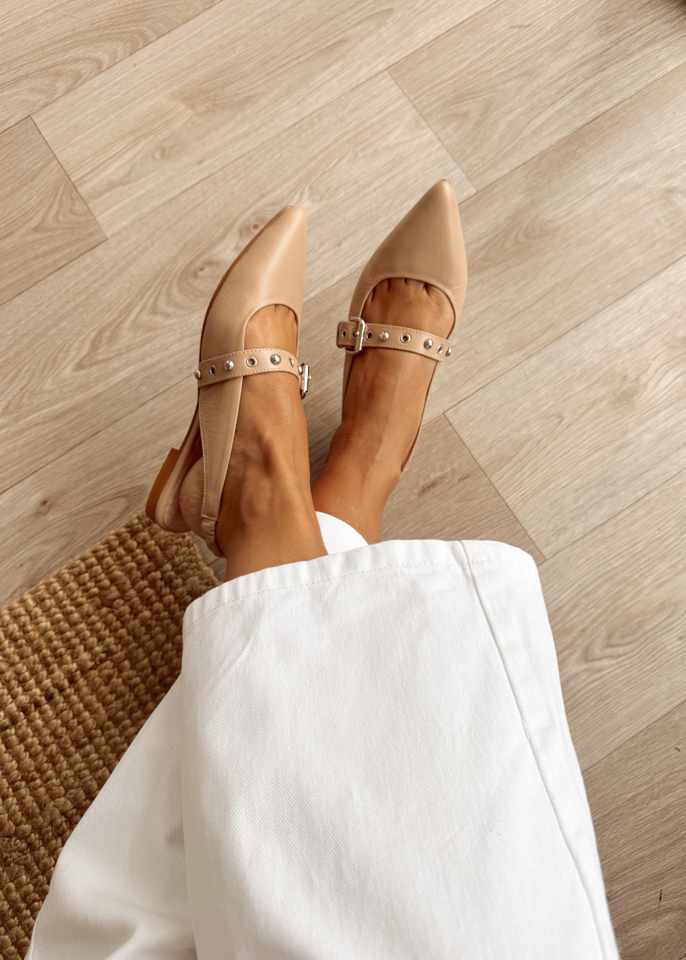 Baleta fabricada en cuero con correa sobre la capellada, taches y remaches, hebilla para graduar en plateado tacón de medio cm.