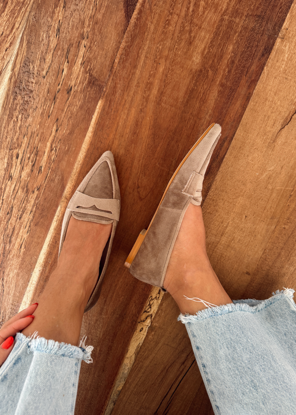 Baleta fabricada en velvet con tacón de 1 cm, terminación delantera en punta.