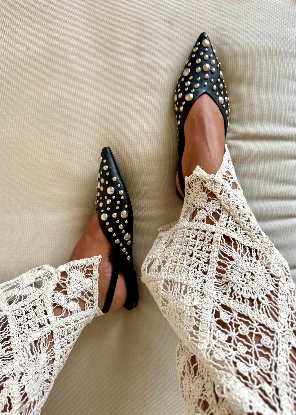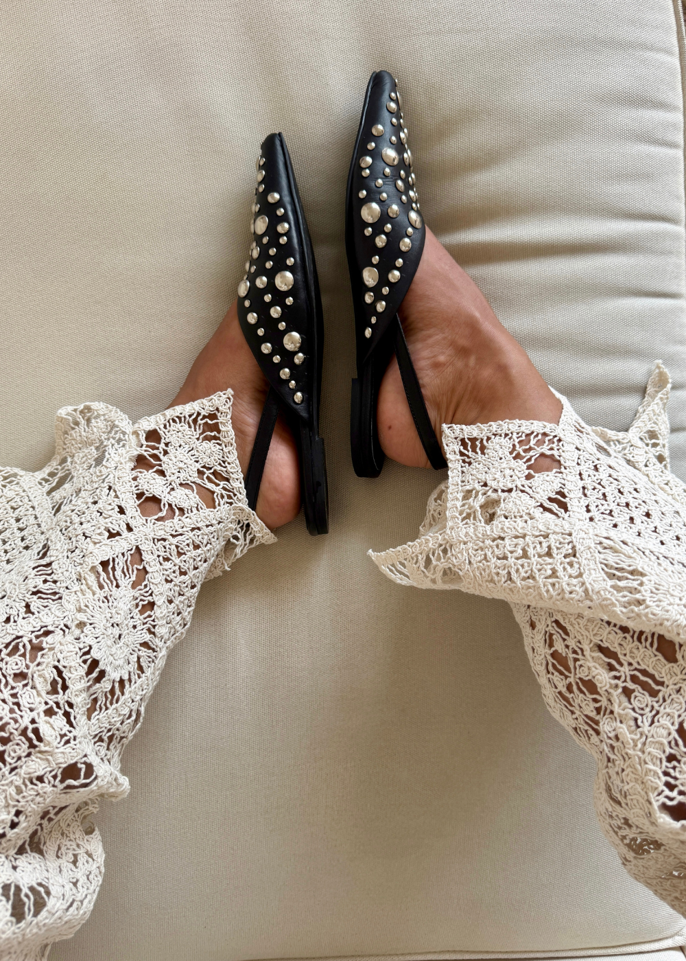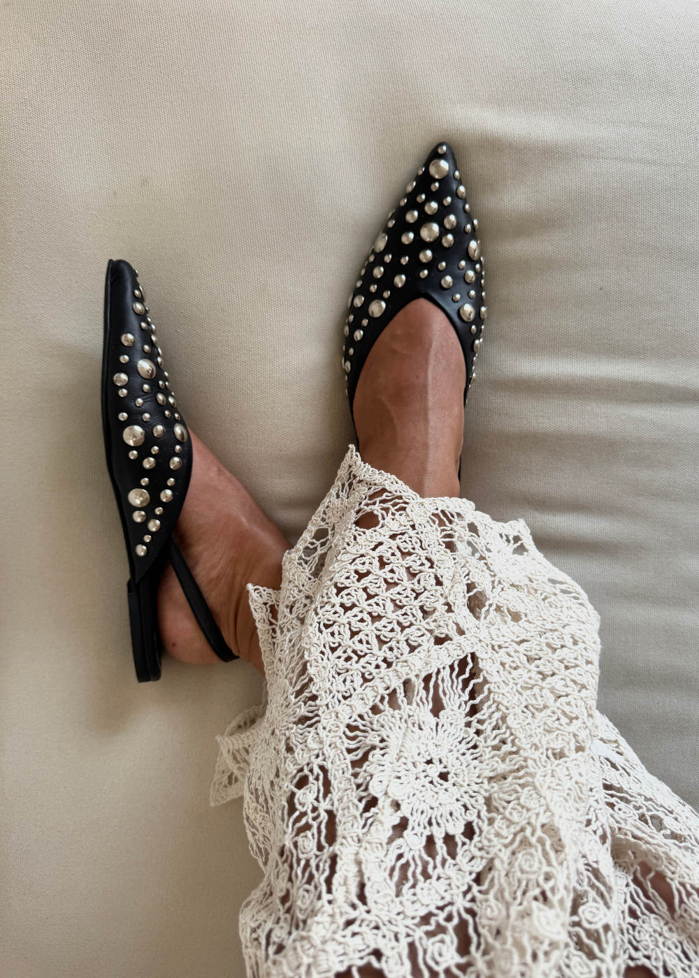 Baleta fabricada en cuero negro, con taches en diferentes tamaños sobre la capellada, destalonada con hebilla para graduar.