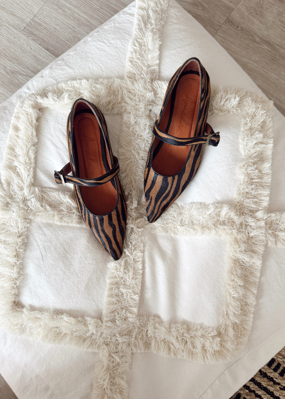 Baleta fabricada en cuero pelo con ribete alrededor en cuero negro correa en el empeine del mismo cuero con hebilla para graduar.