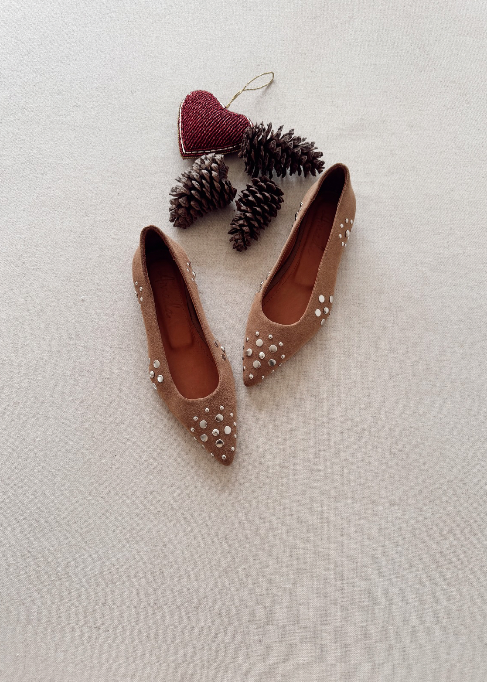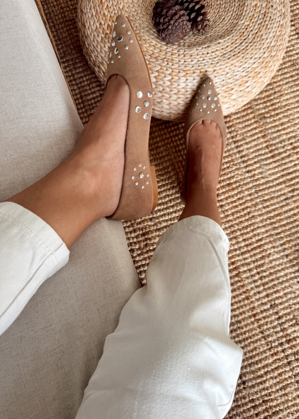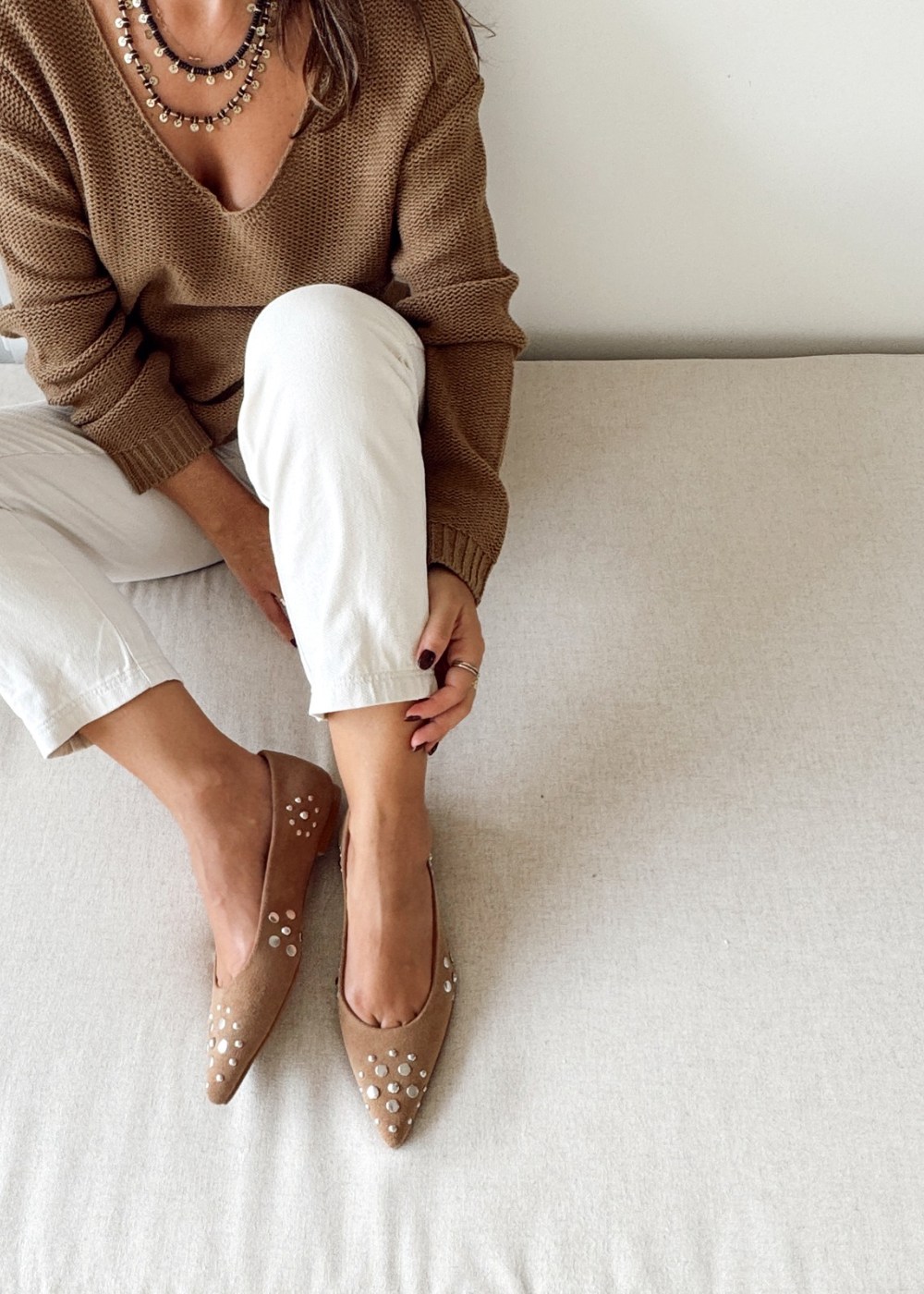 Baleta fabricada en cuero carnaza sobre la Capellada taches redondos color plata en diferentes tamaños.