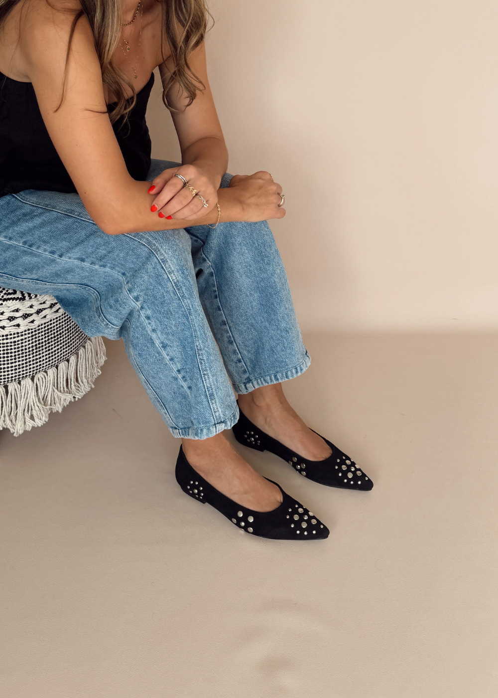 Fabricada en cuero gamo (cuero de cabrito) sobre la Capellada y laterales taches en color plata. Tacón de medio centímetro