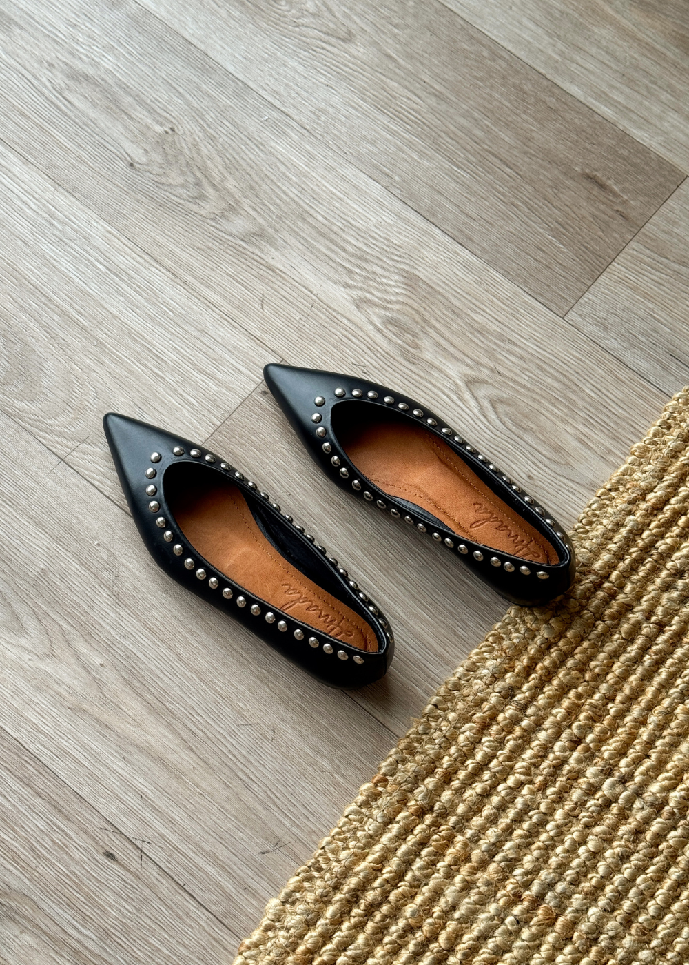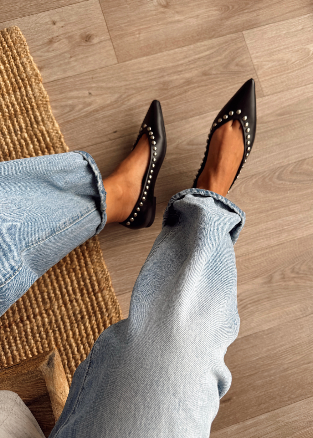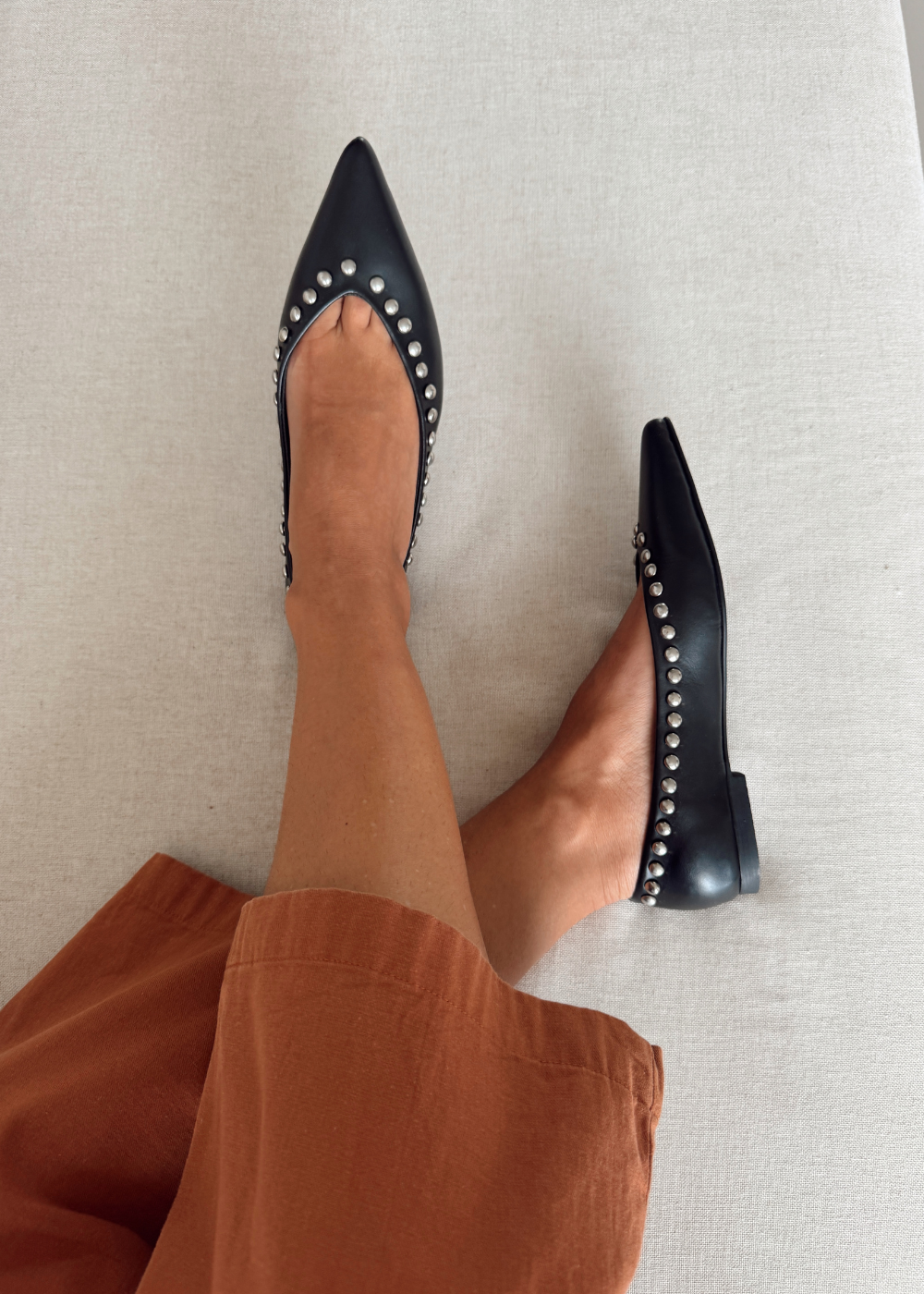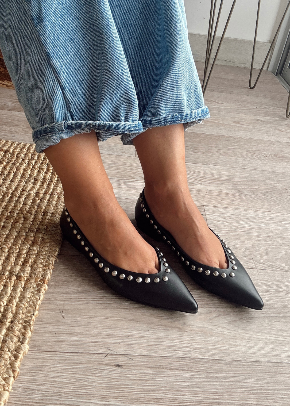 Fabricada en cuero, sobre la capellada taches medianos plateadas, tacón de 1 cm.