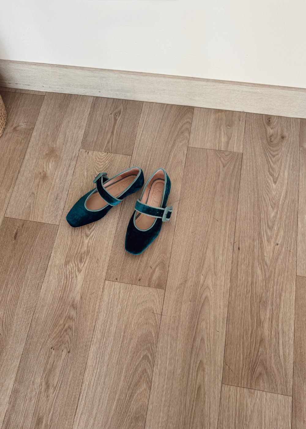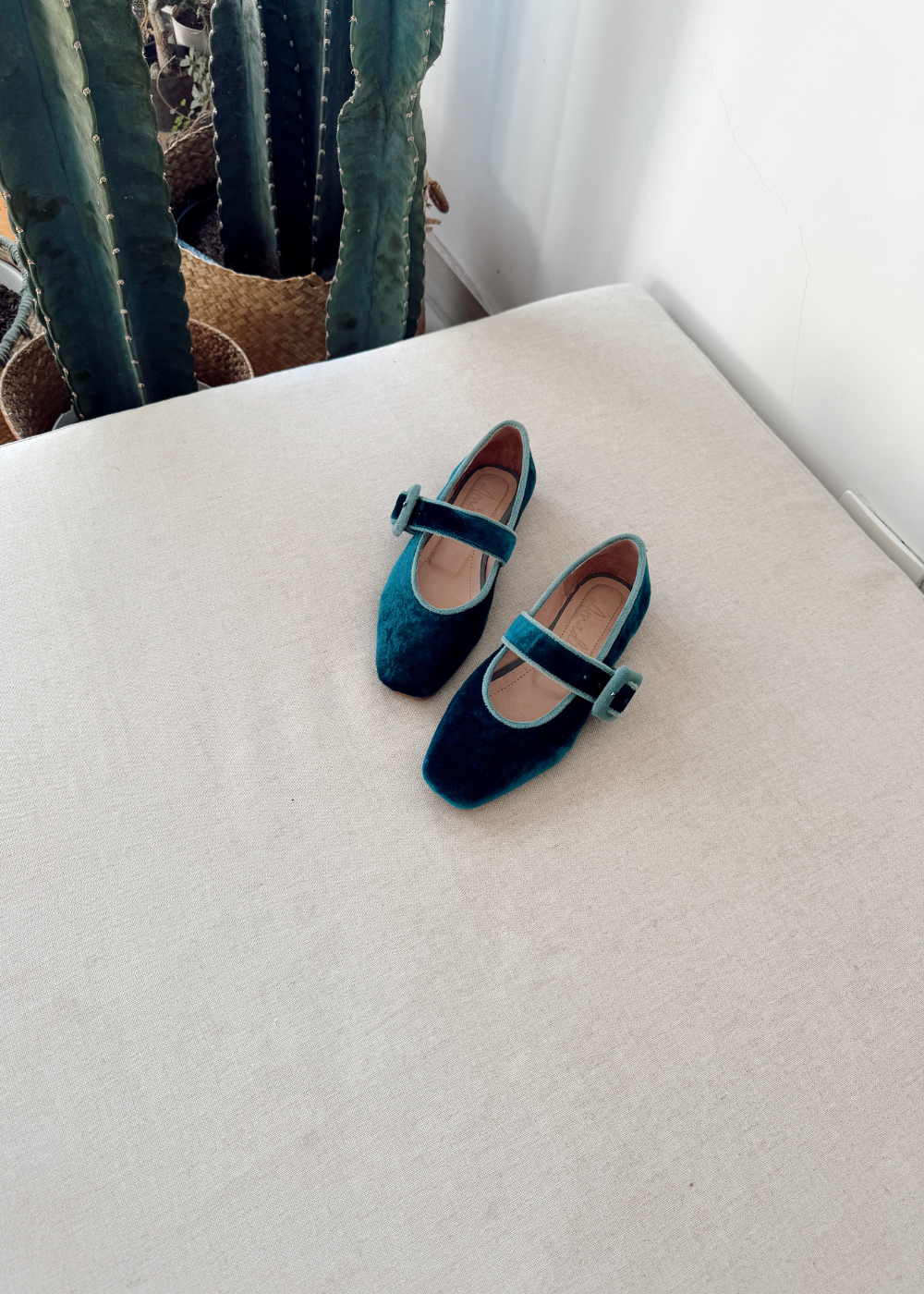 Baleta fabricada en velvet (textil especial para calzado), sobre la capellada correa forrada en el mismo material de un tono más claro, tacón de medio centímetro.