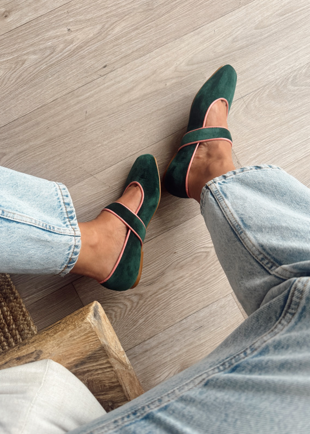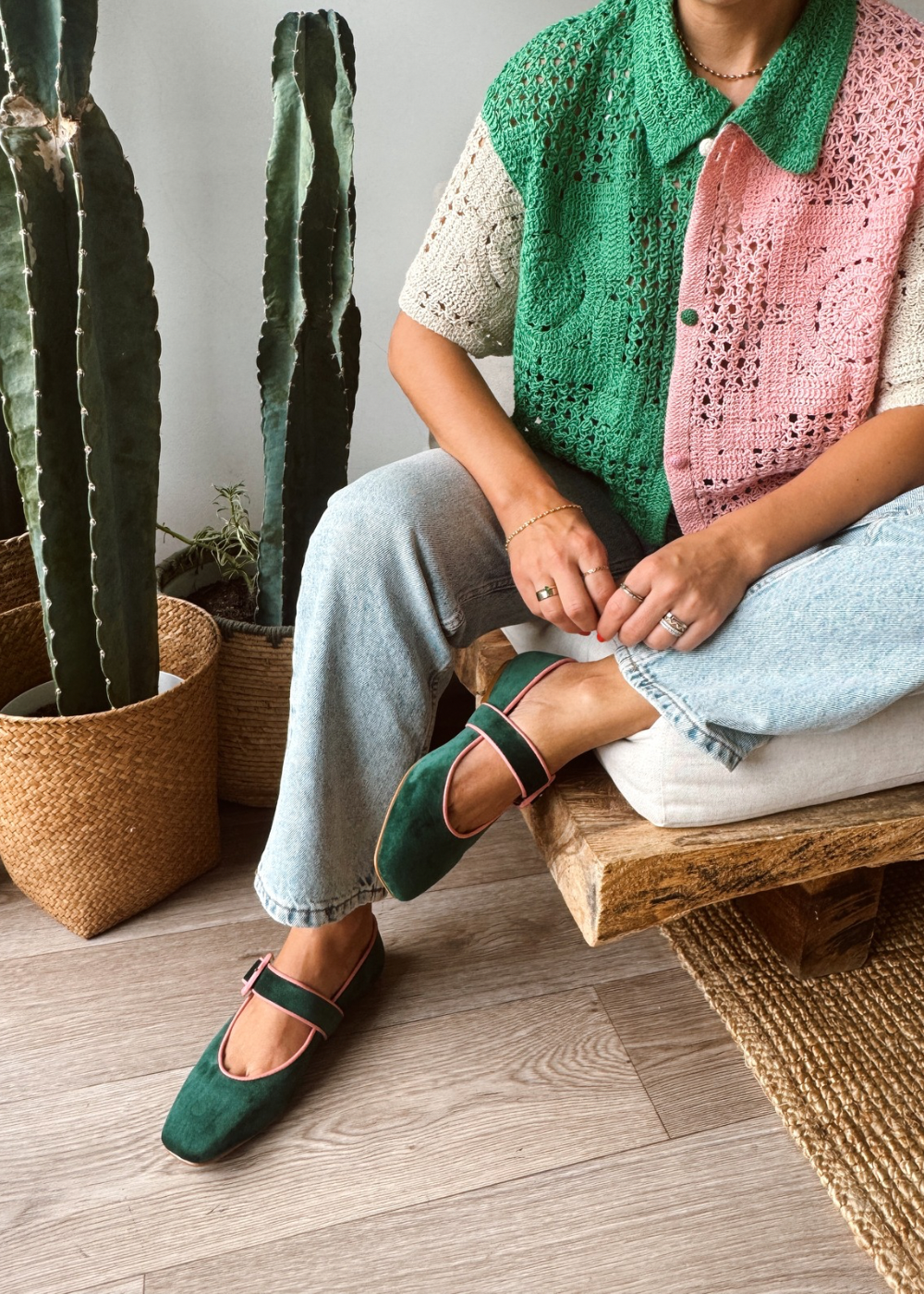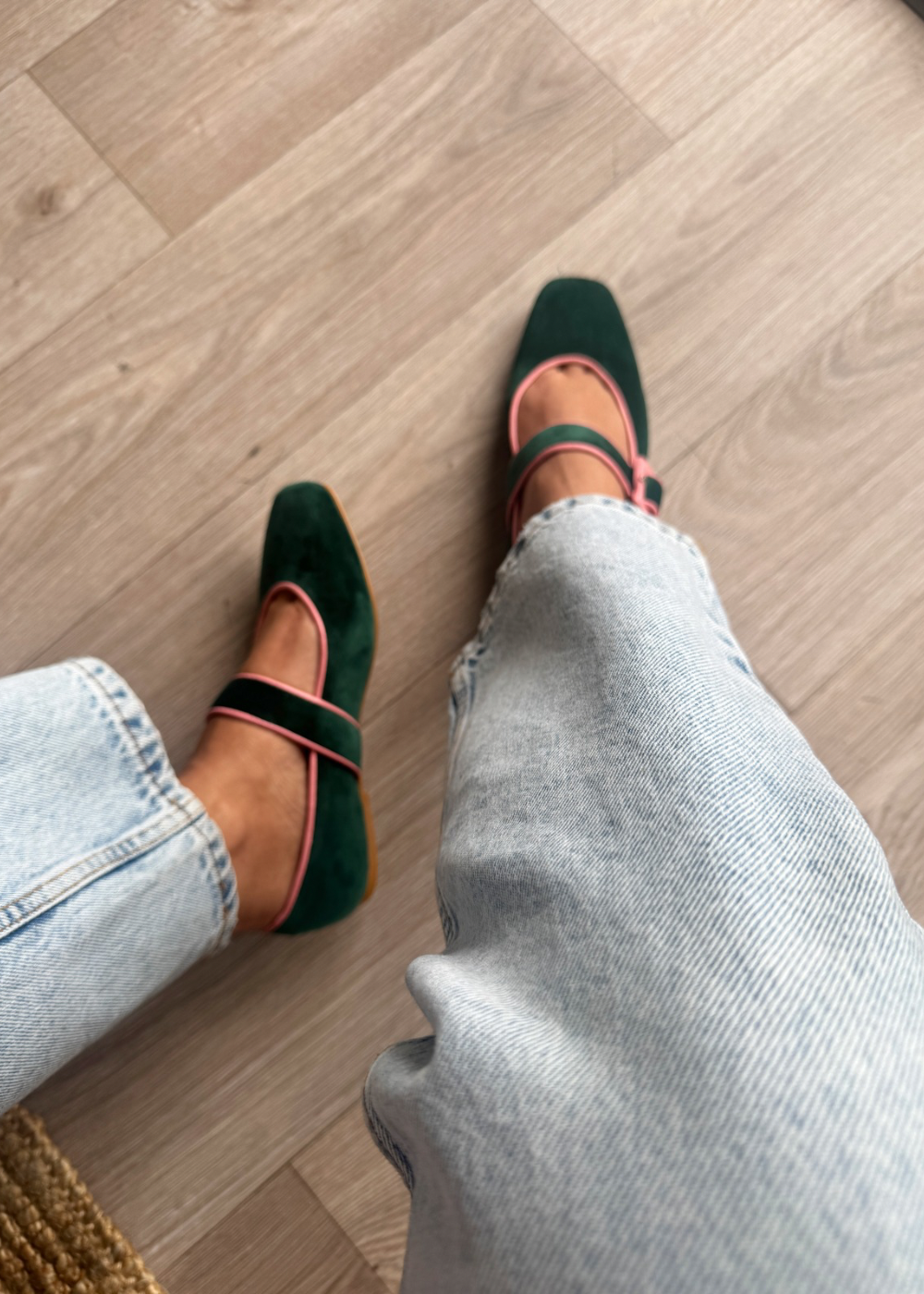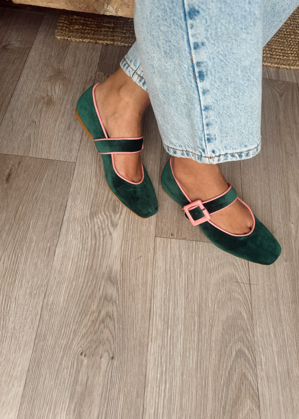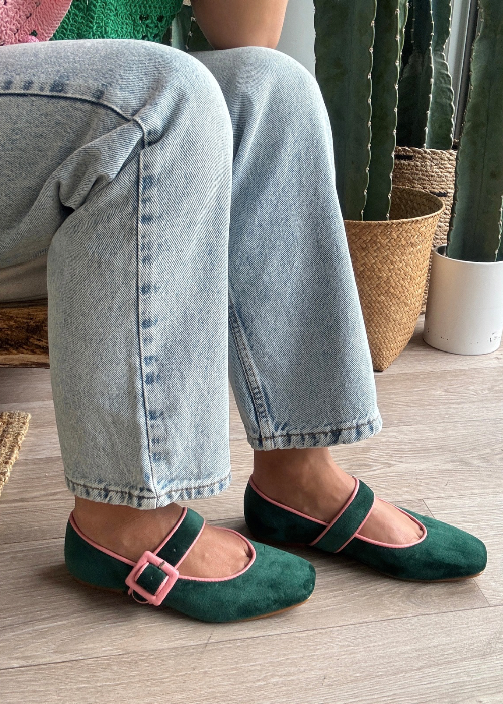 Baleta fabricada en velvet (textil) el ribete y hebilla forrada en cuero rosa, tacón de medio cm.