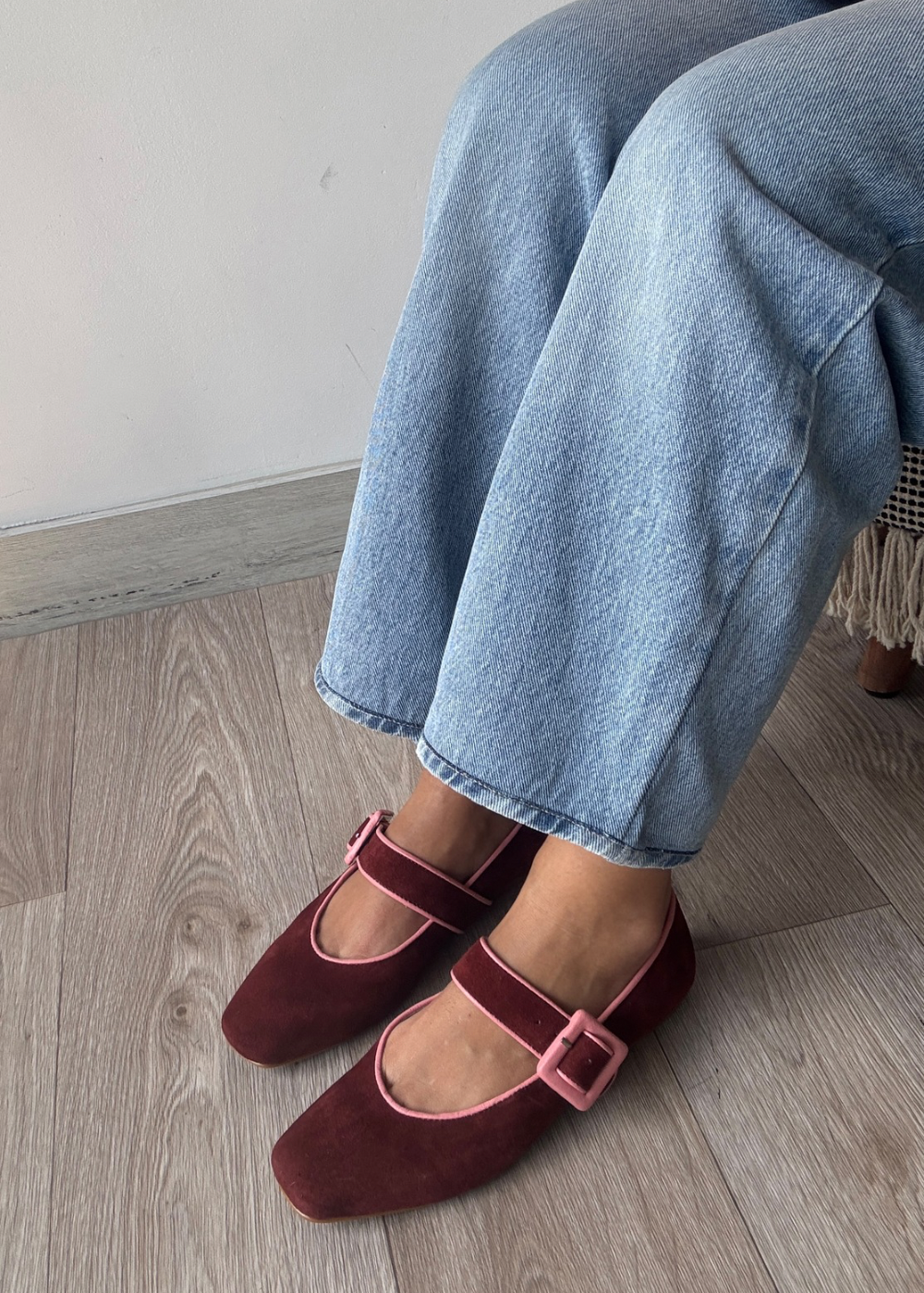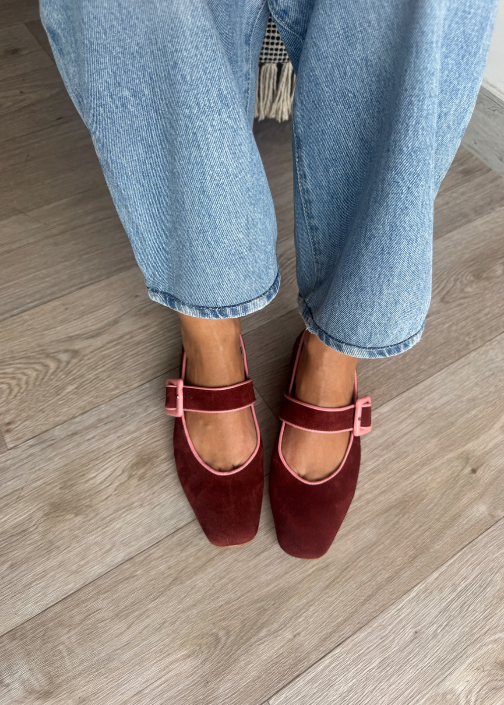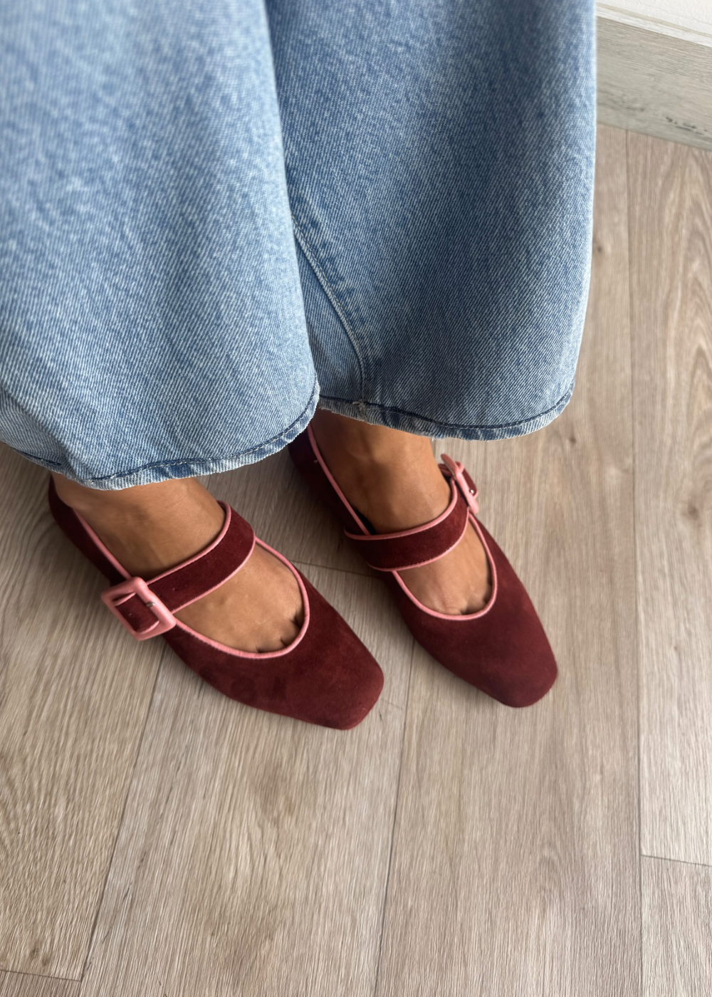 Baleta fabricada en cuero gamo con ribete y hebilla forrado en cuero liso rosa, tacón de medio cm.