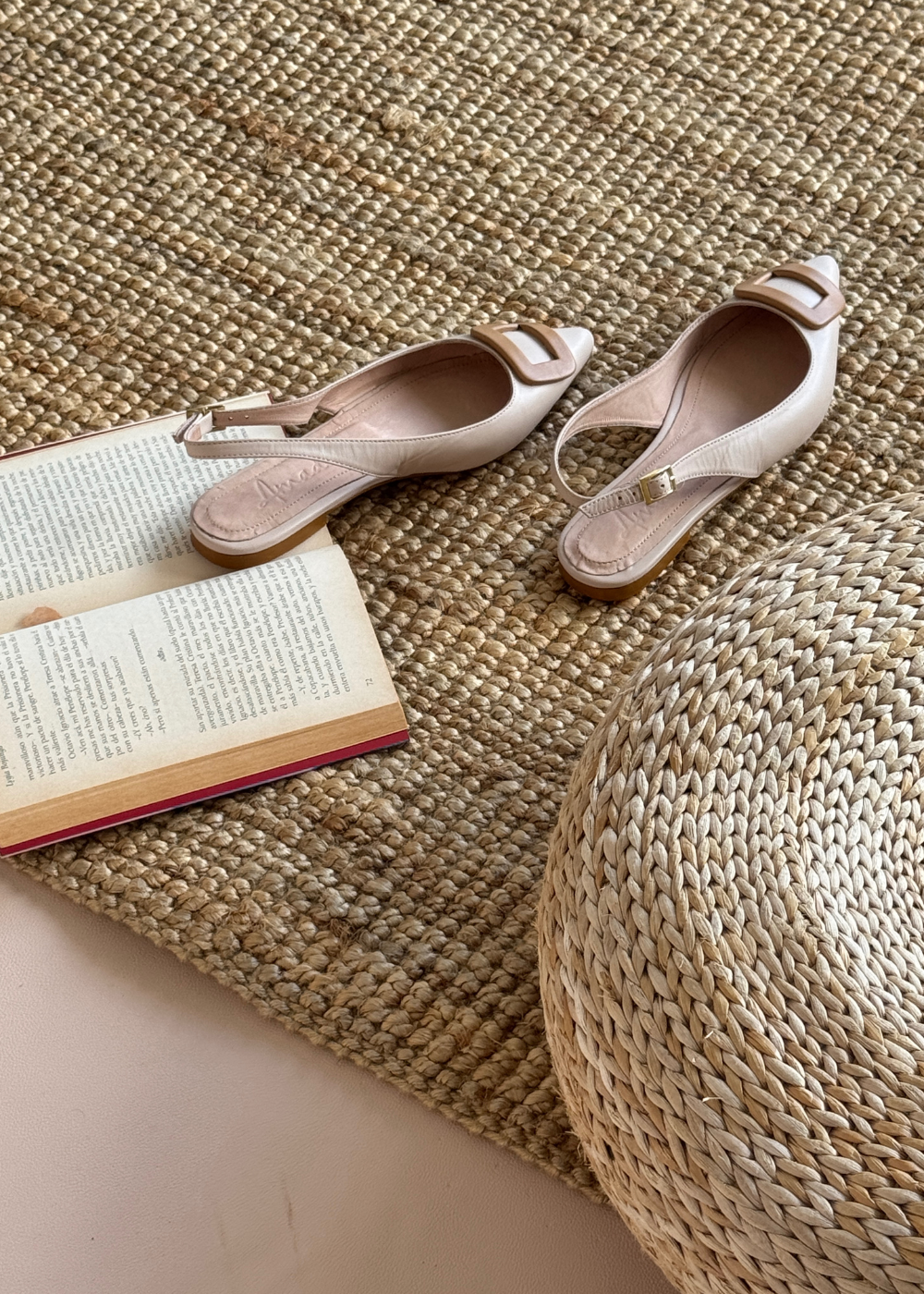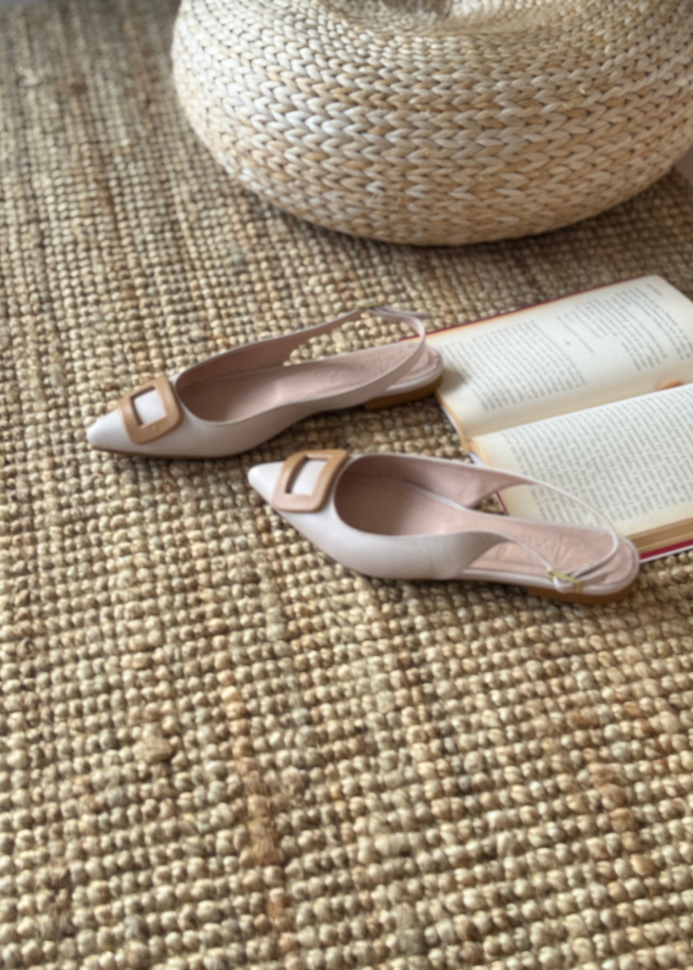 Baleta fabricada en cuero color marfil, con accesorio cuadrado en la capellada en cuero miel, tacón de medio cm con correa en talón y hebilla para graduar.