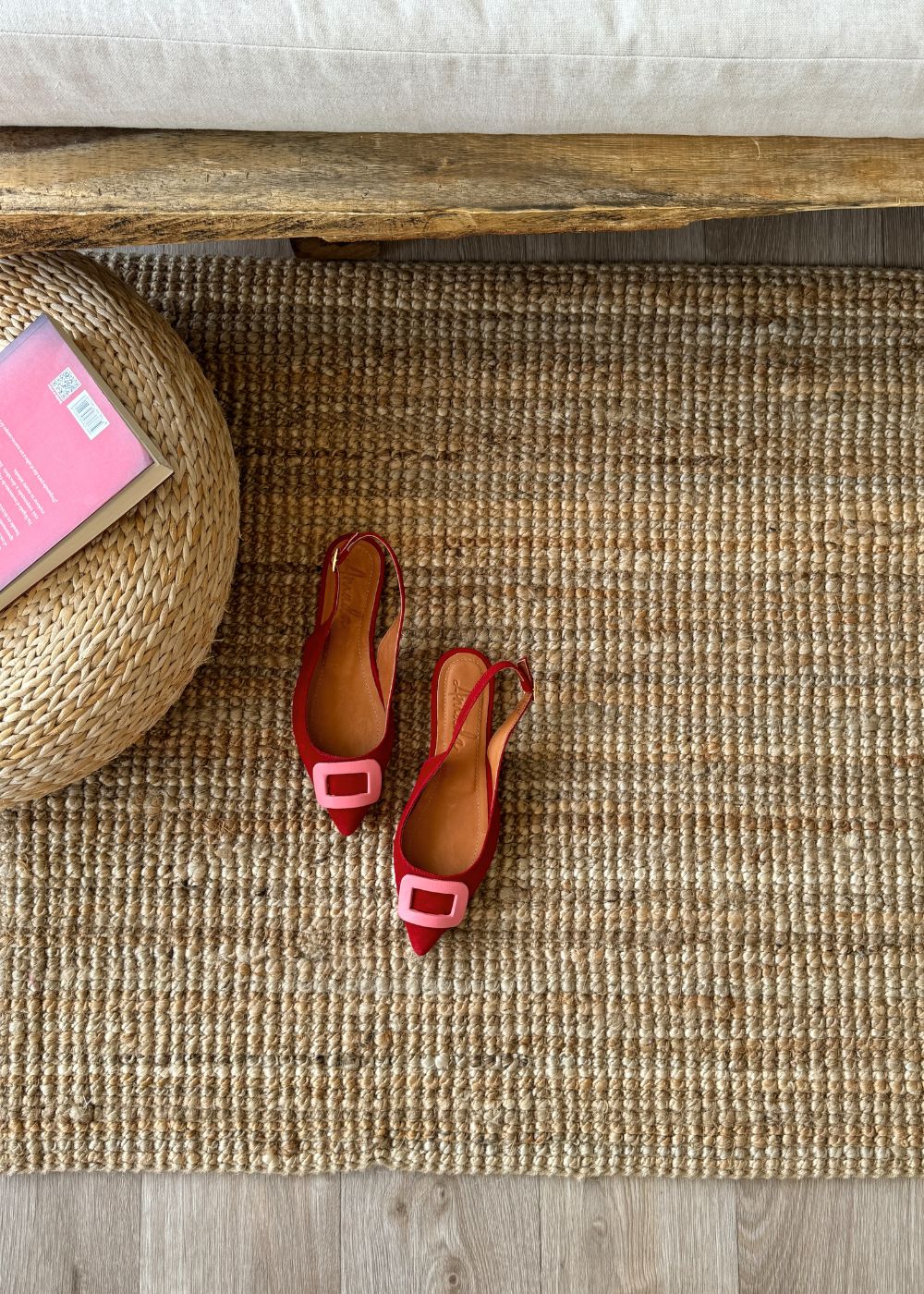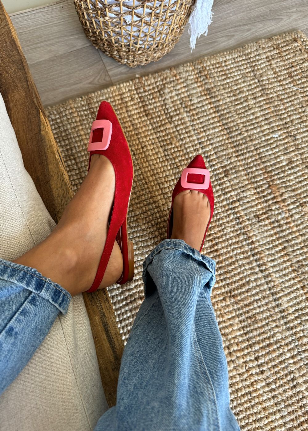 Baleta fabricada en cuero gamuza color rojo, sobre la capellada cuadro forrado en cuero liso color rosado, terminación delantera en punta, tacón de medio cm y correa trasera con hebilla para graduar.