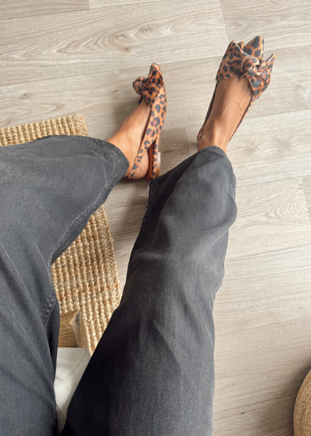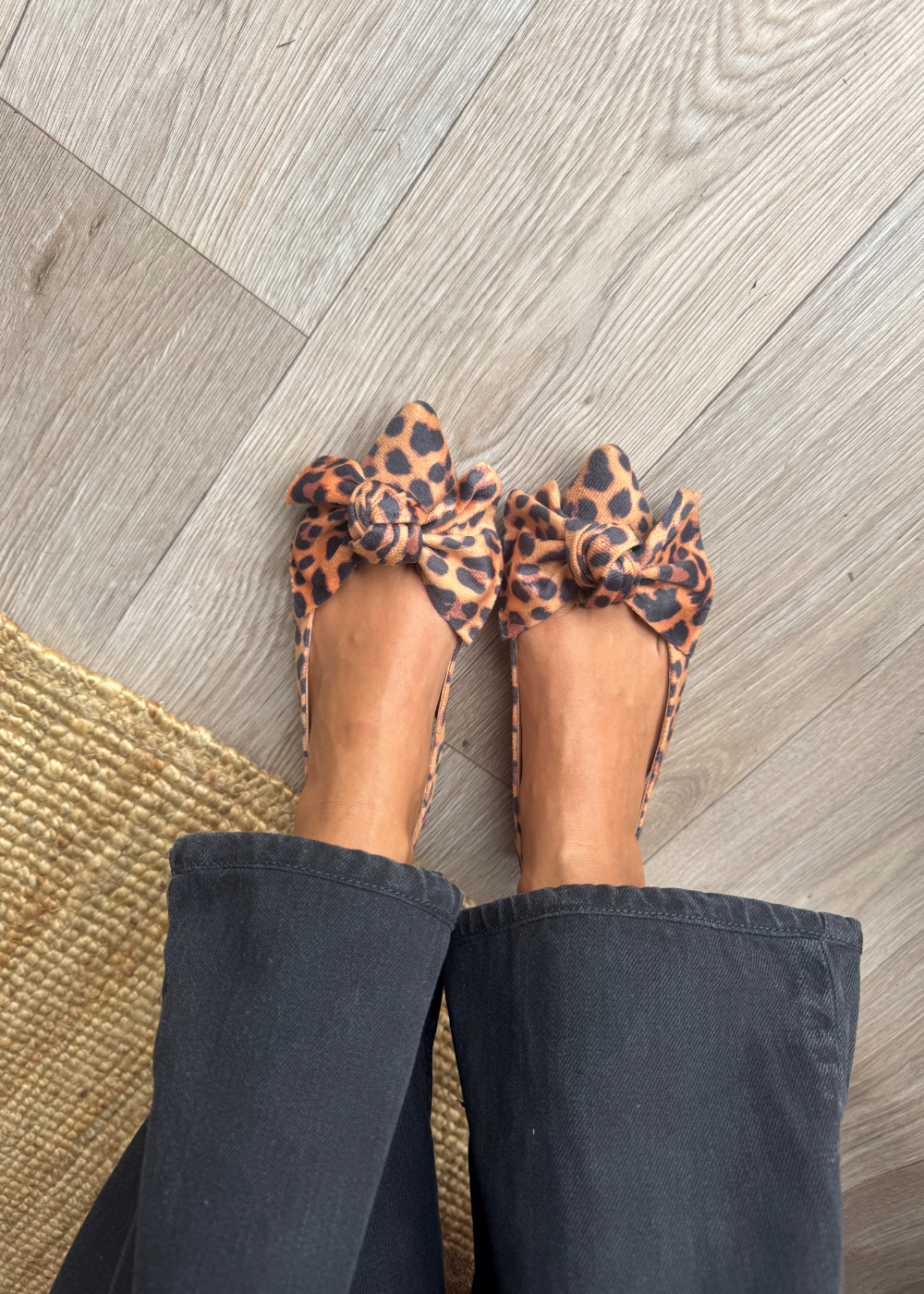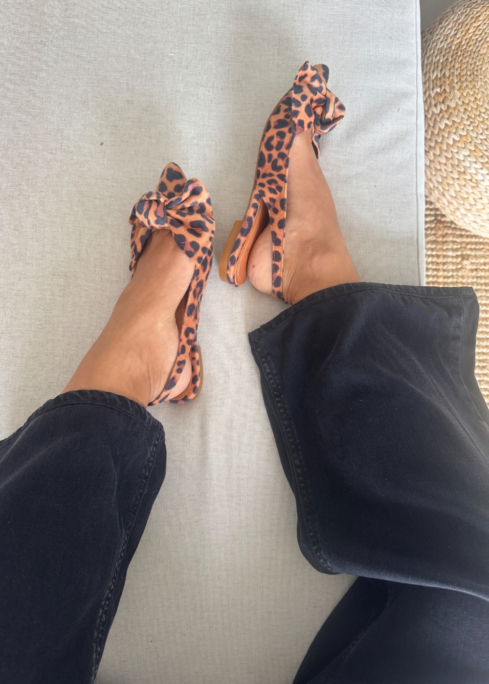 Fabricada en velvet tela especial para calzado con sublimado en animal print, sobre la capellada moño del mismo material tacón de medio cm.