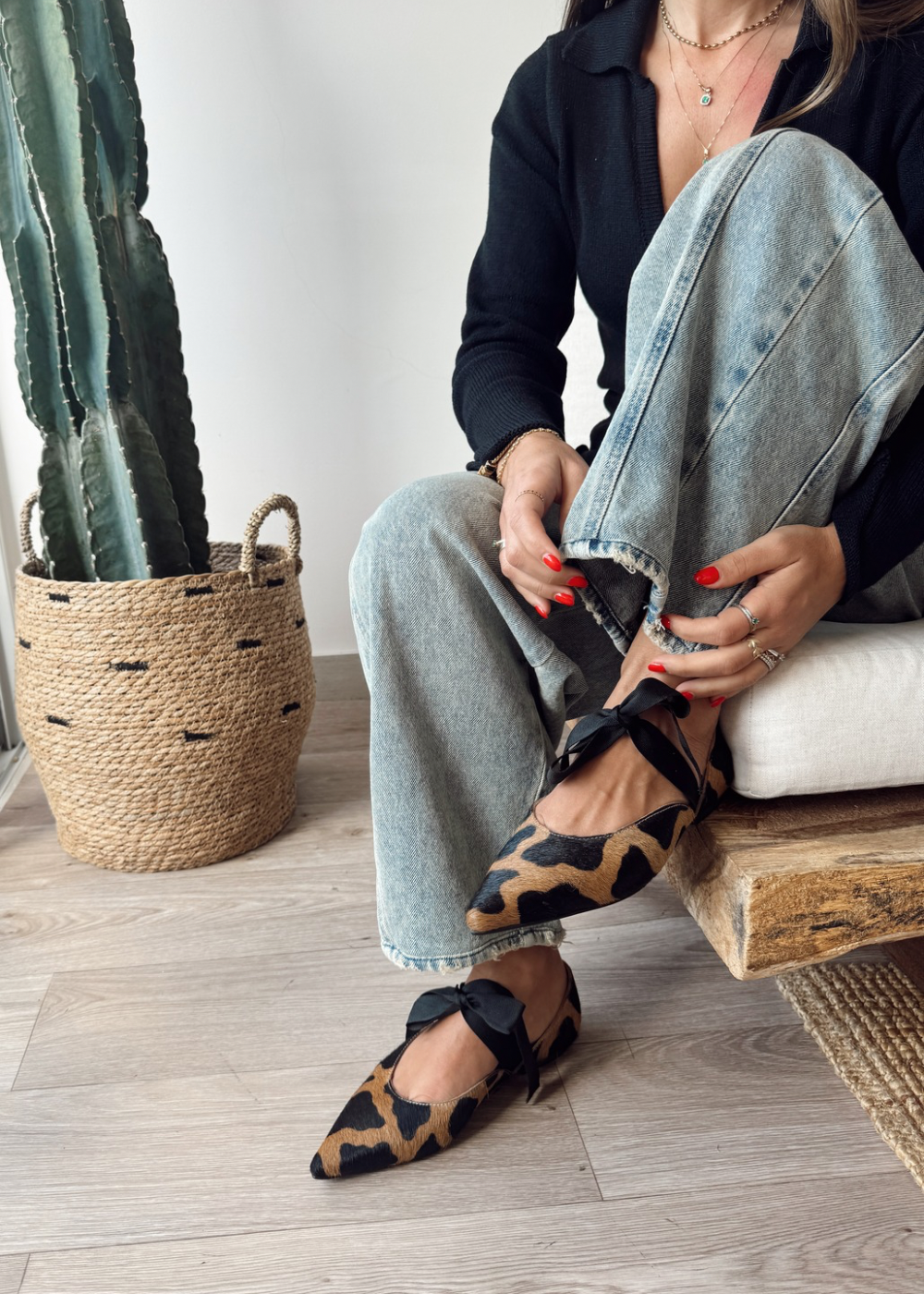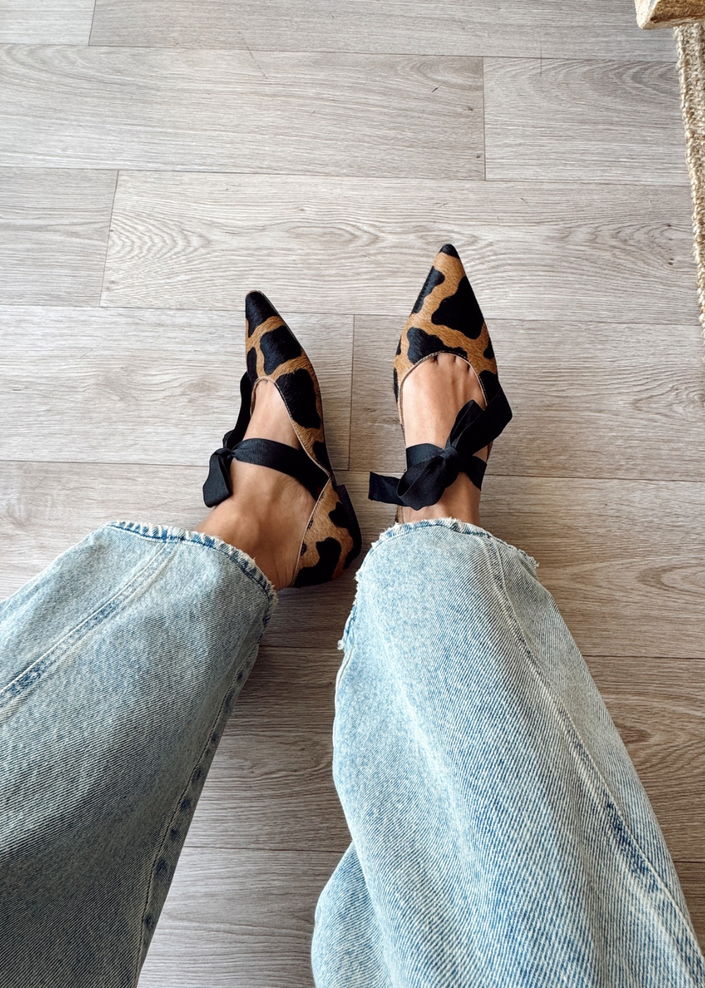 Baleta fabricada en cuero de vaca con estampación de animal print tacón de medio cm, sobre la capellada cintas de amarre en tela.