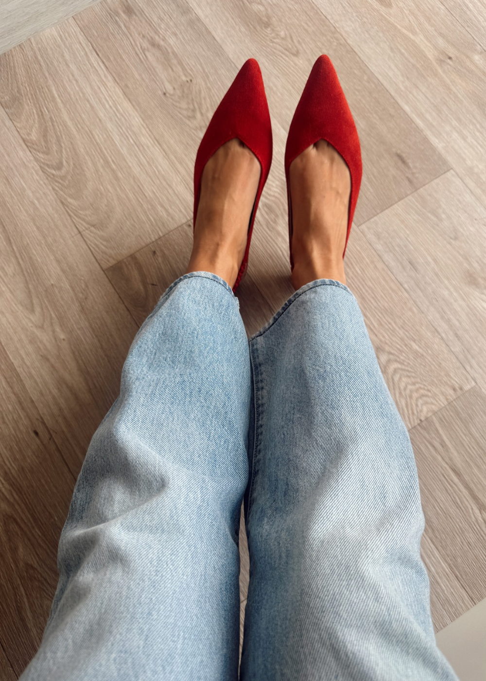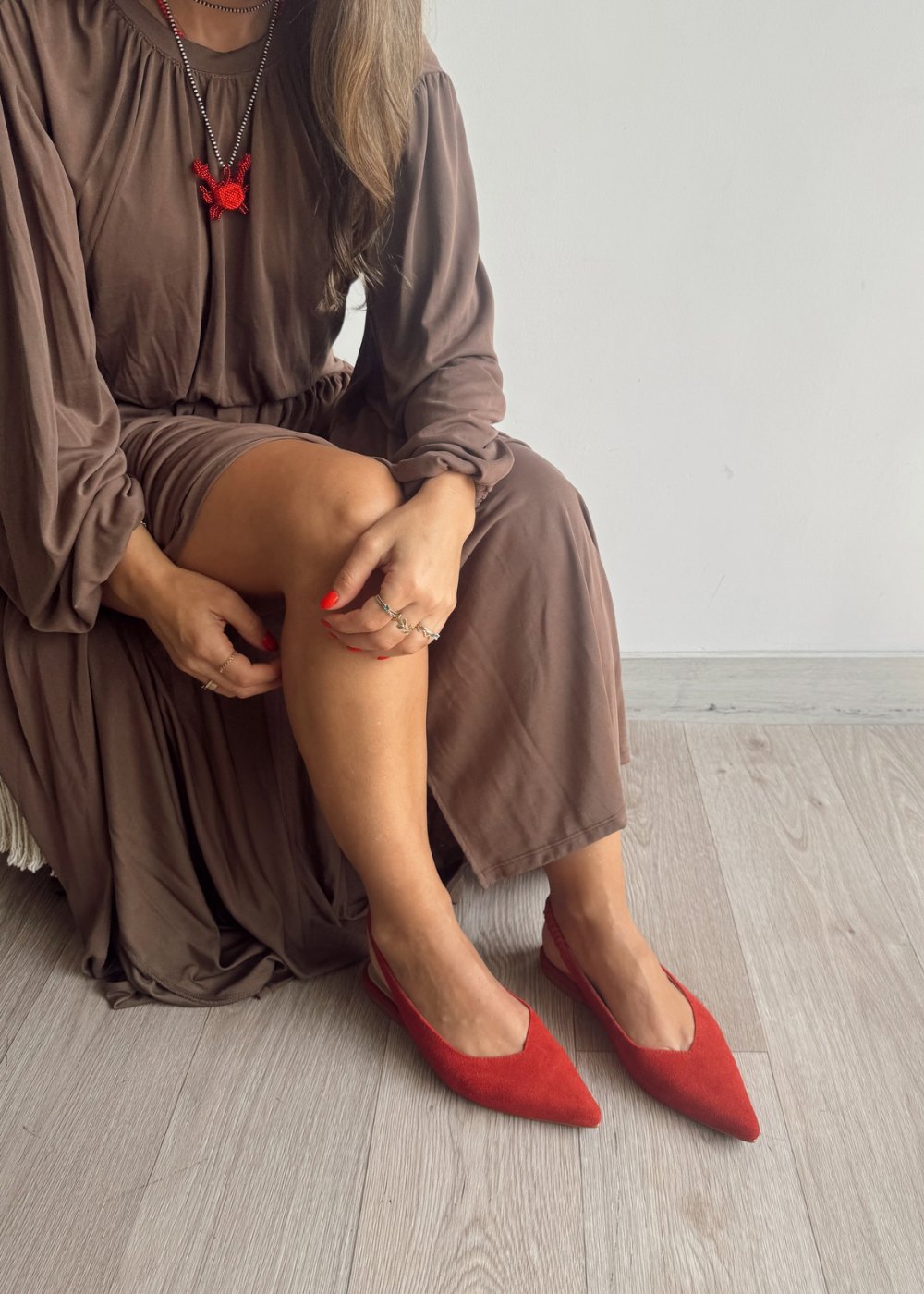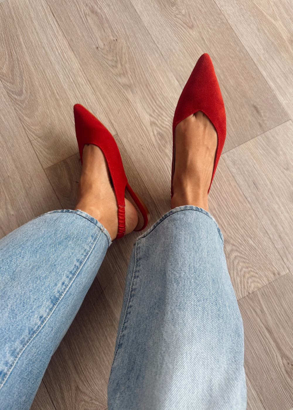 Baleta fabricada en cuero carnaza rojo, tacón de 1 cm y medio.