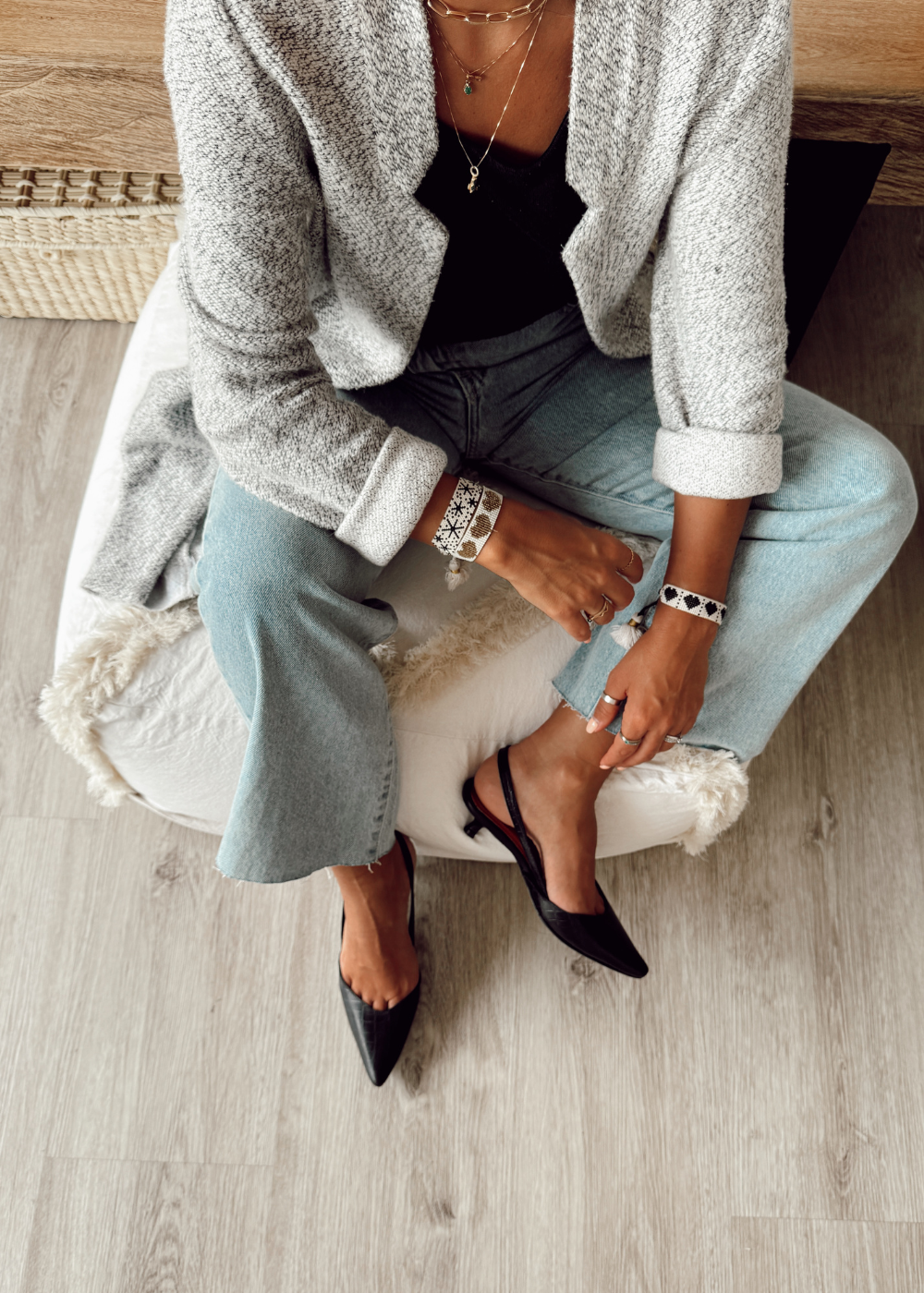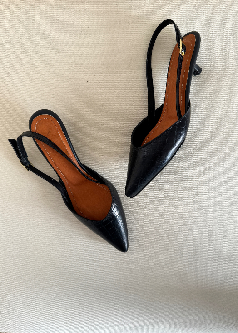 Tacón fabricado en cuero con textura color negro, tacón de 3 cm y medio estilo puntilla, correa que sujeta el talón con hebilla para graduar.