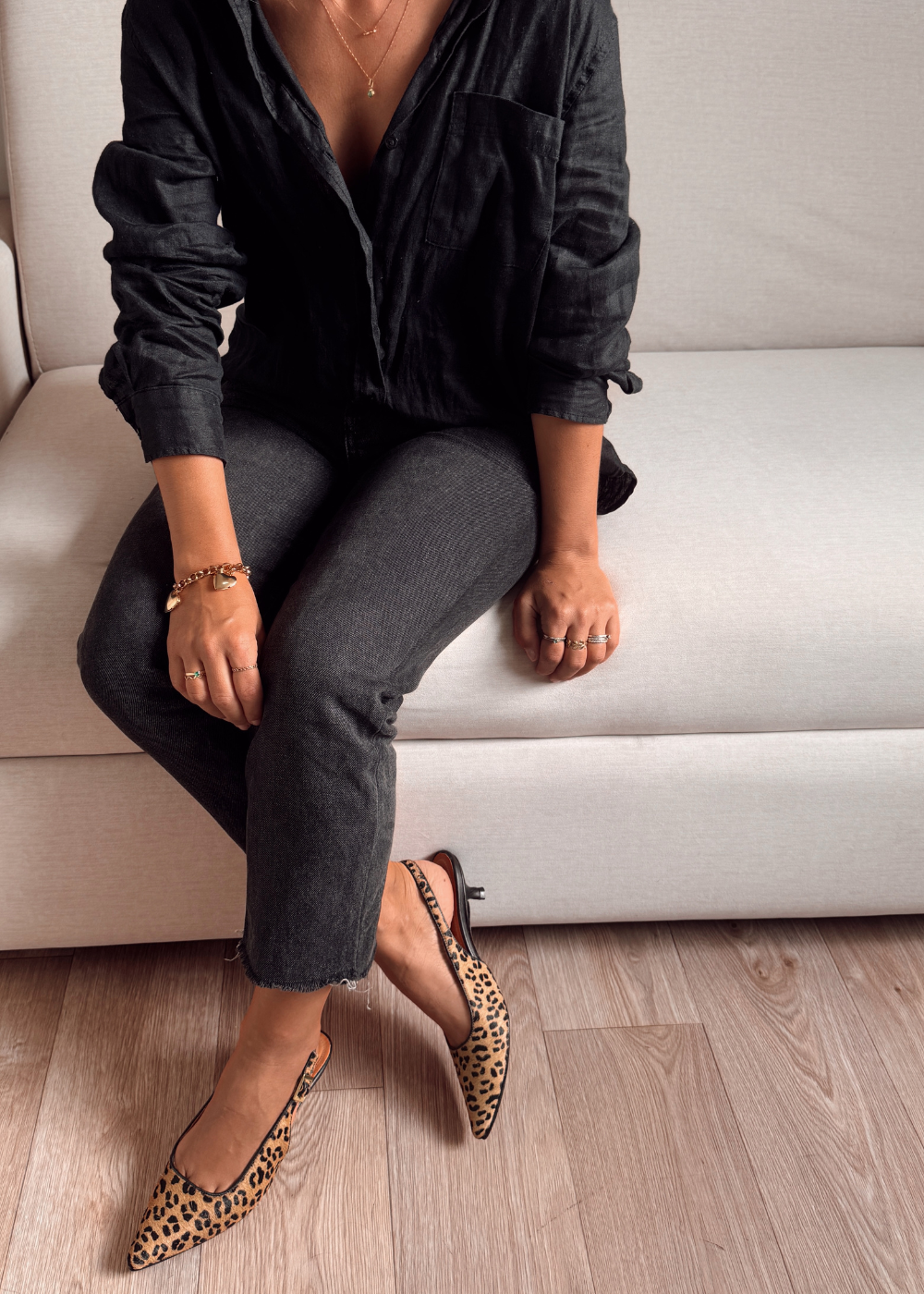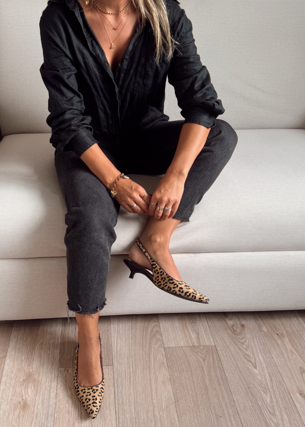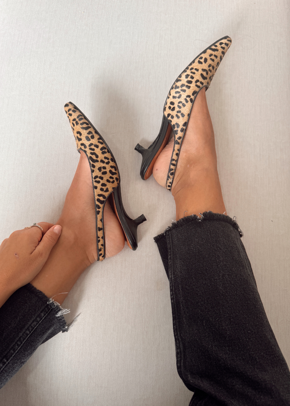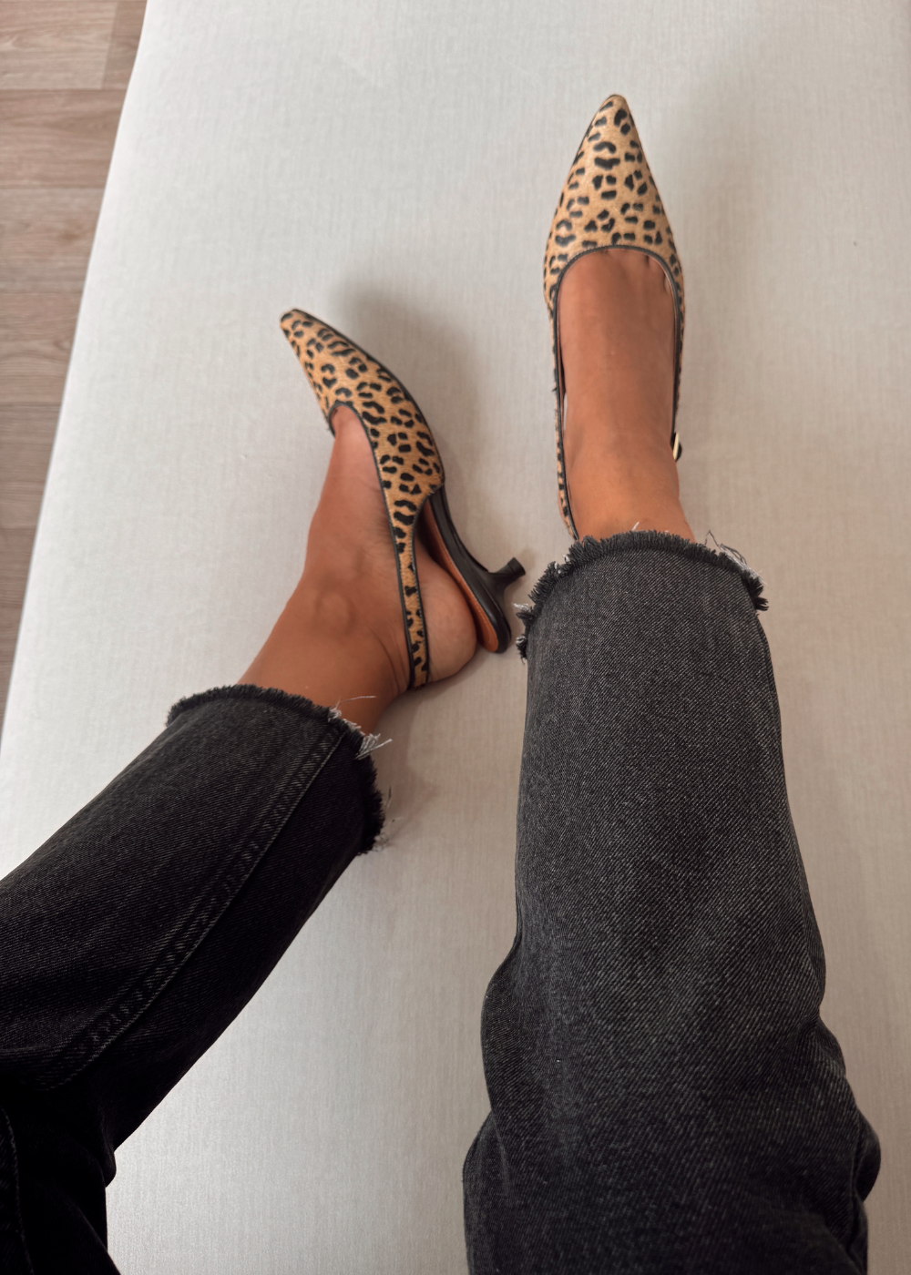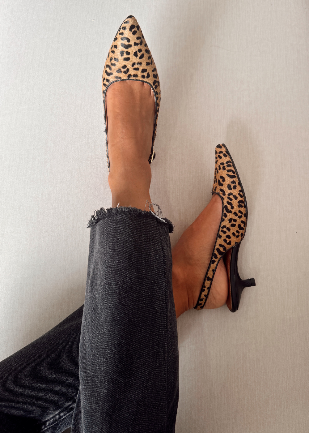 Tacón fabricado en cuero de vaca con estampación de animal print, tacón de 3 cm y medio, puntilla correa en el talón con hebilla para graduar.