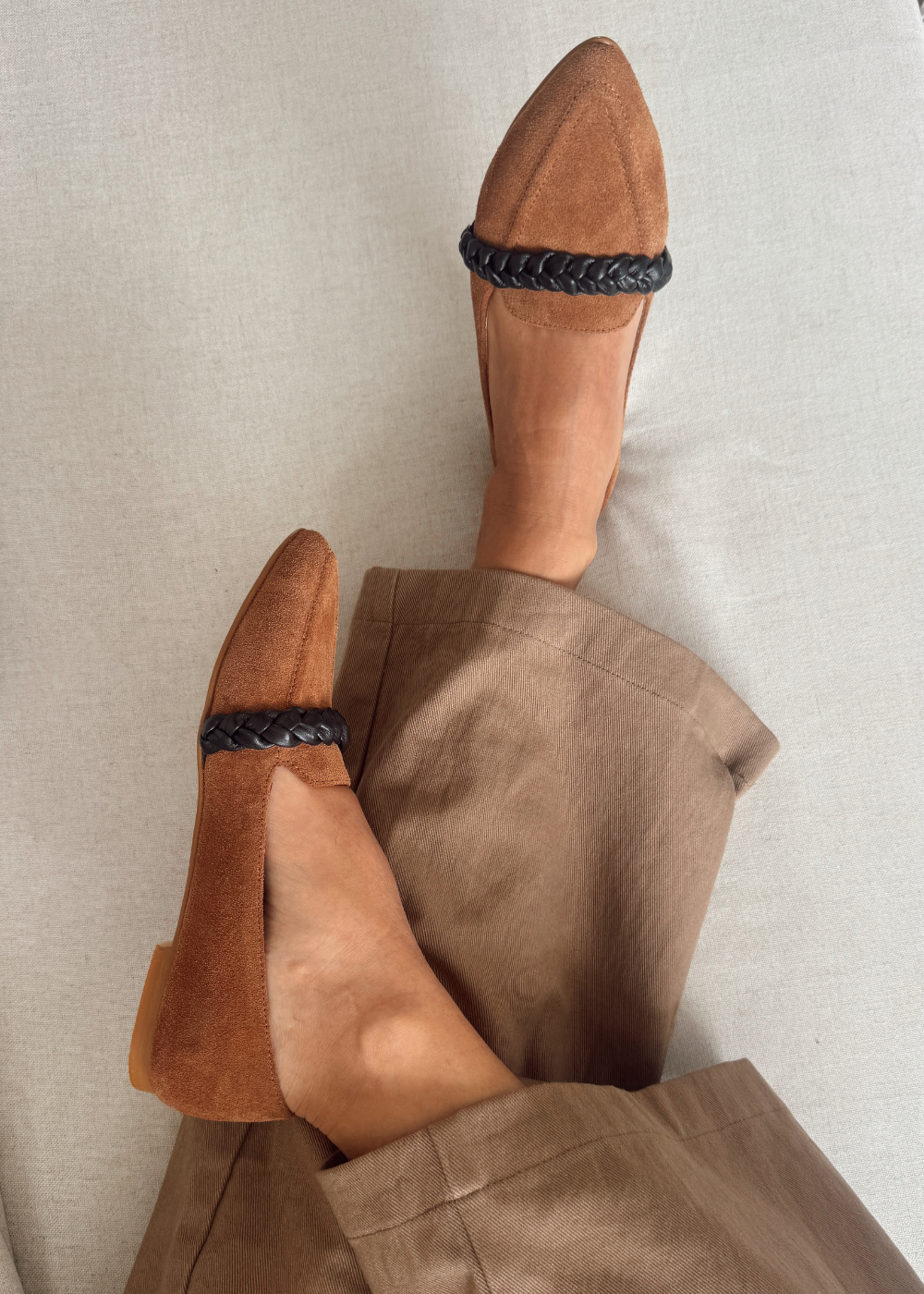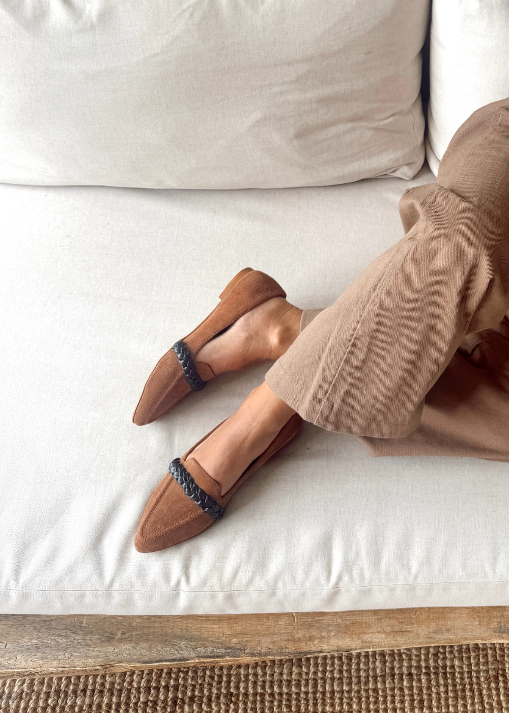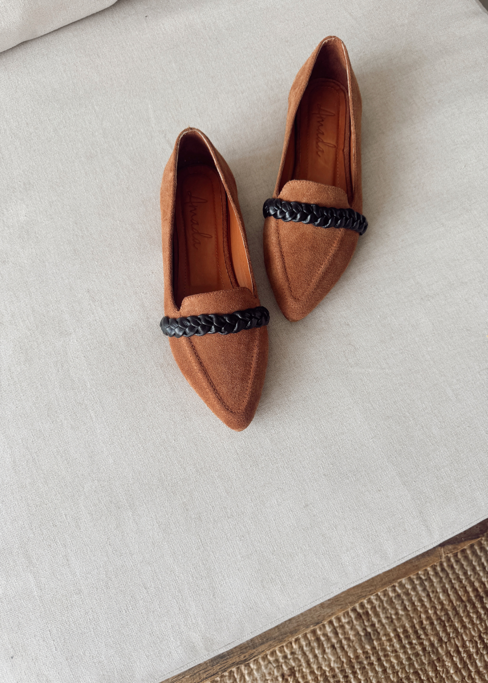 Fabricado en cuero carnasa, sobre la capellada trenza en cuero negro de lado a lado,