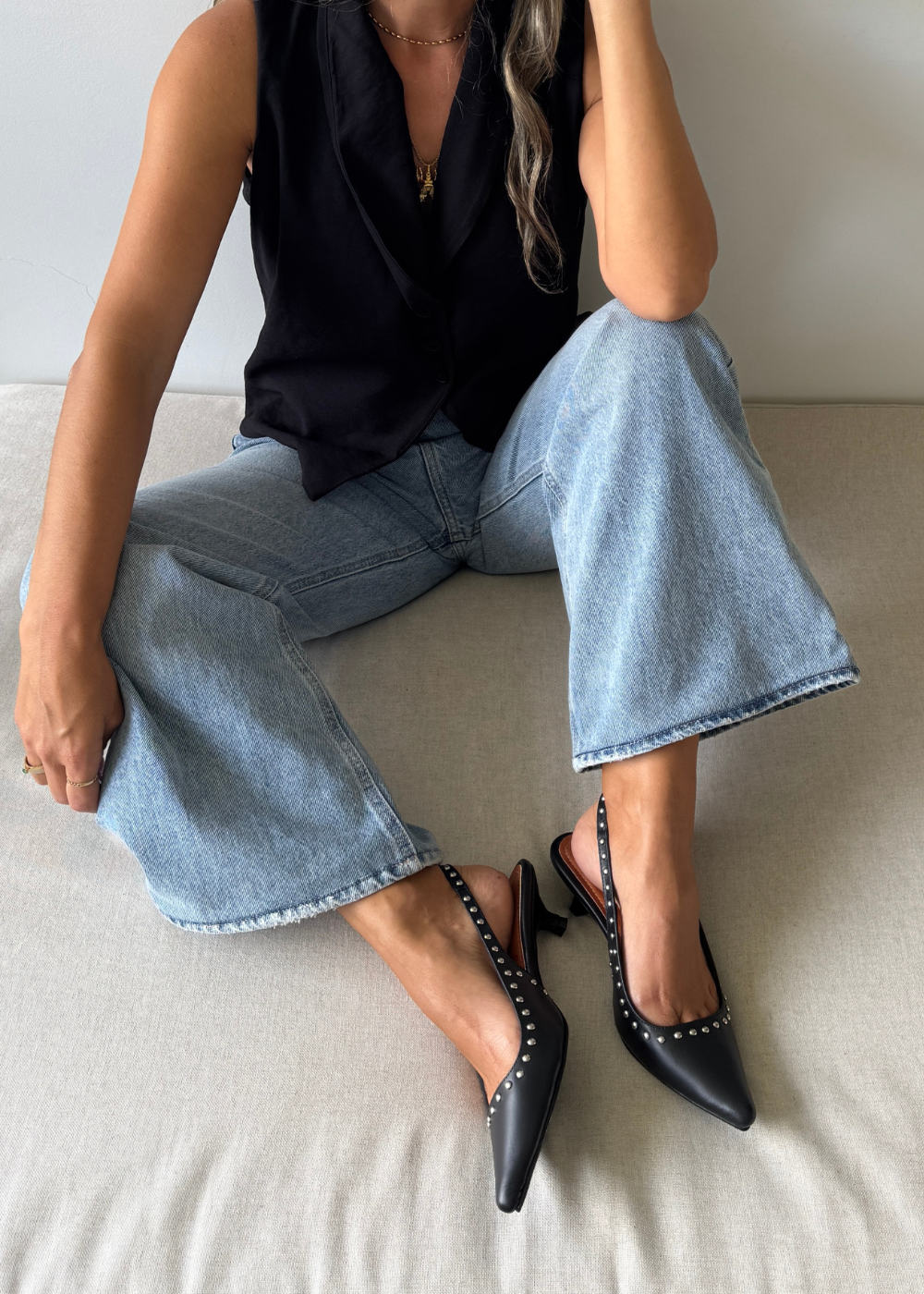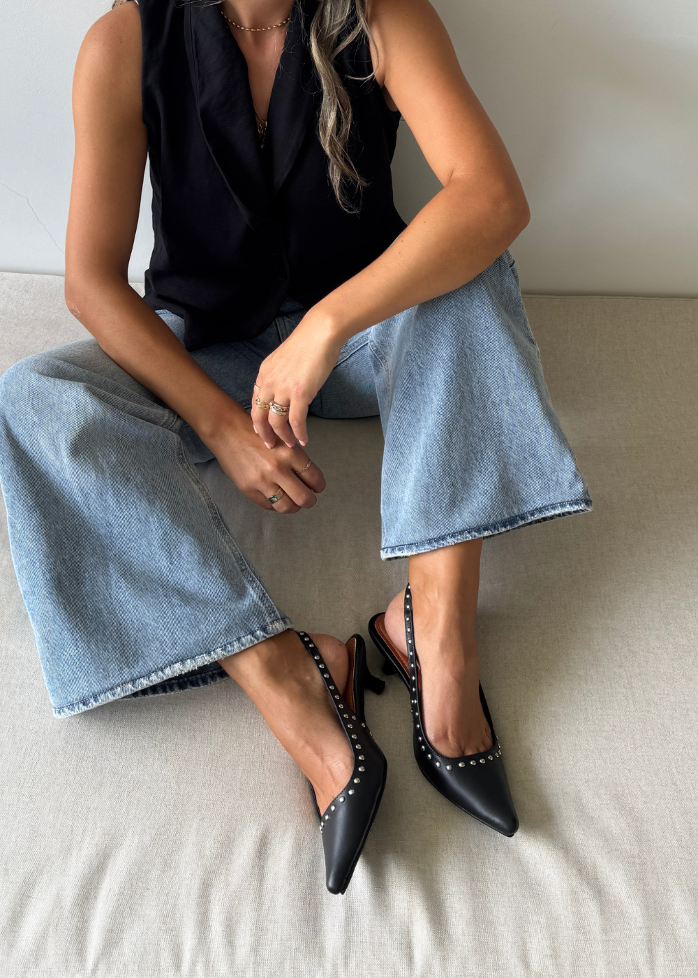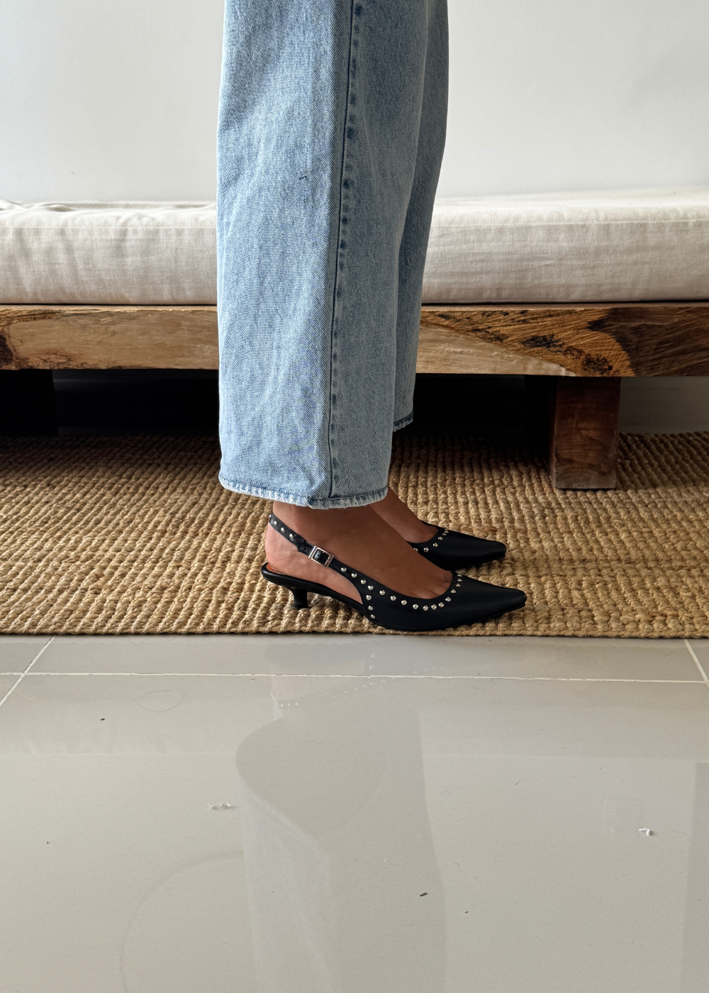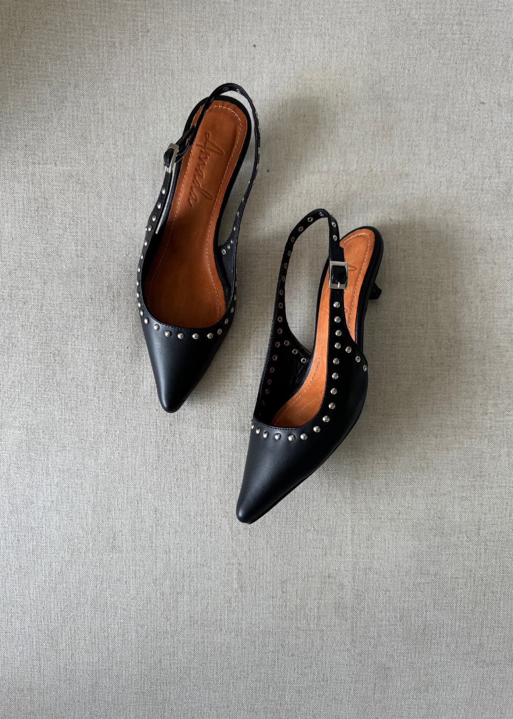 Fabricado en cuero, con taches en plata sobre la capellada, correa trasera con hebilla para graduar, tacón de 3 cm y medio.