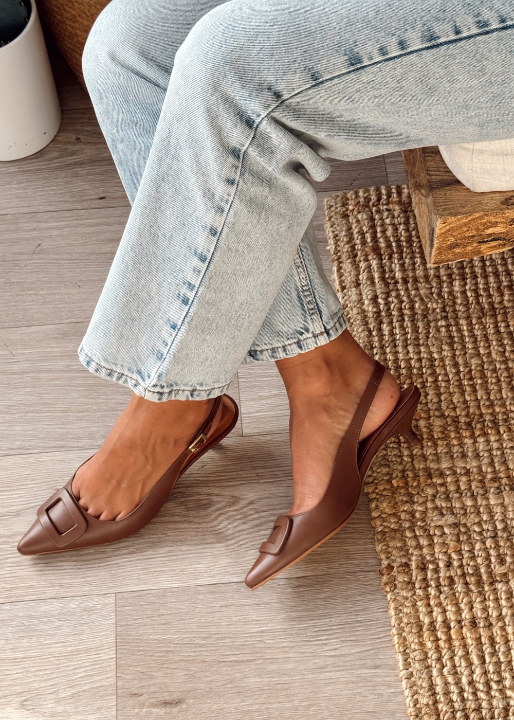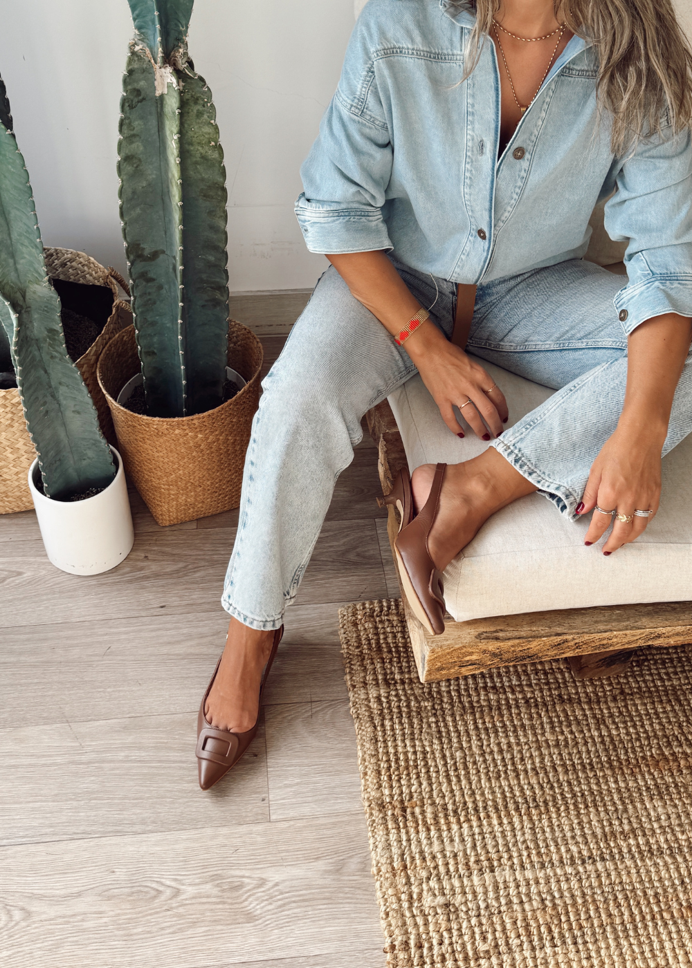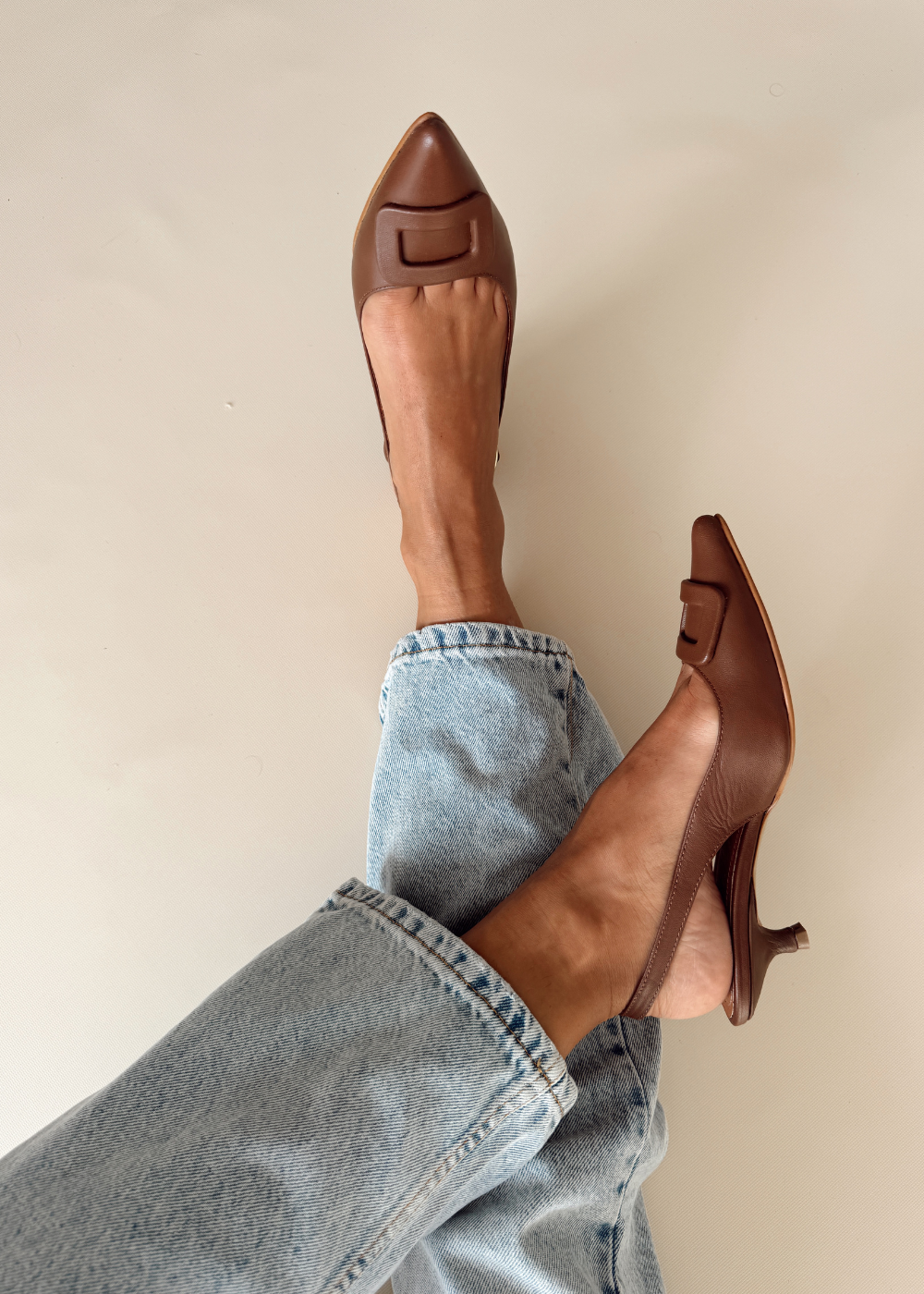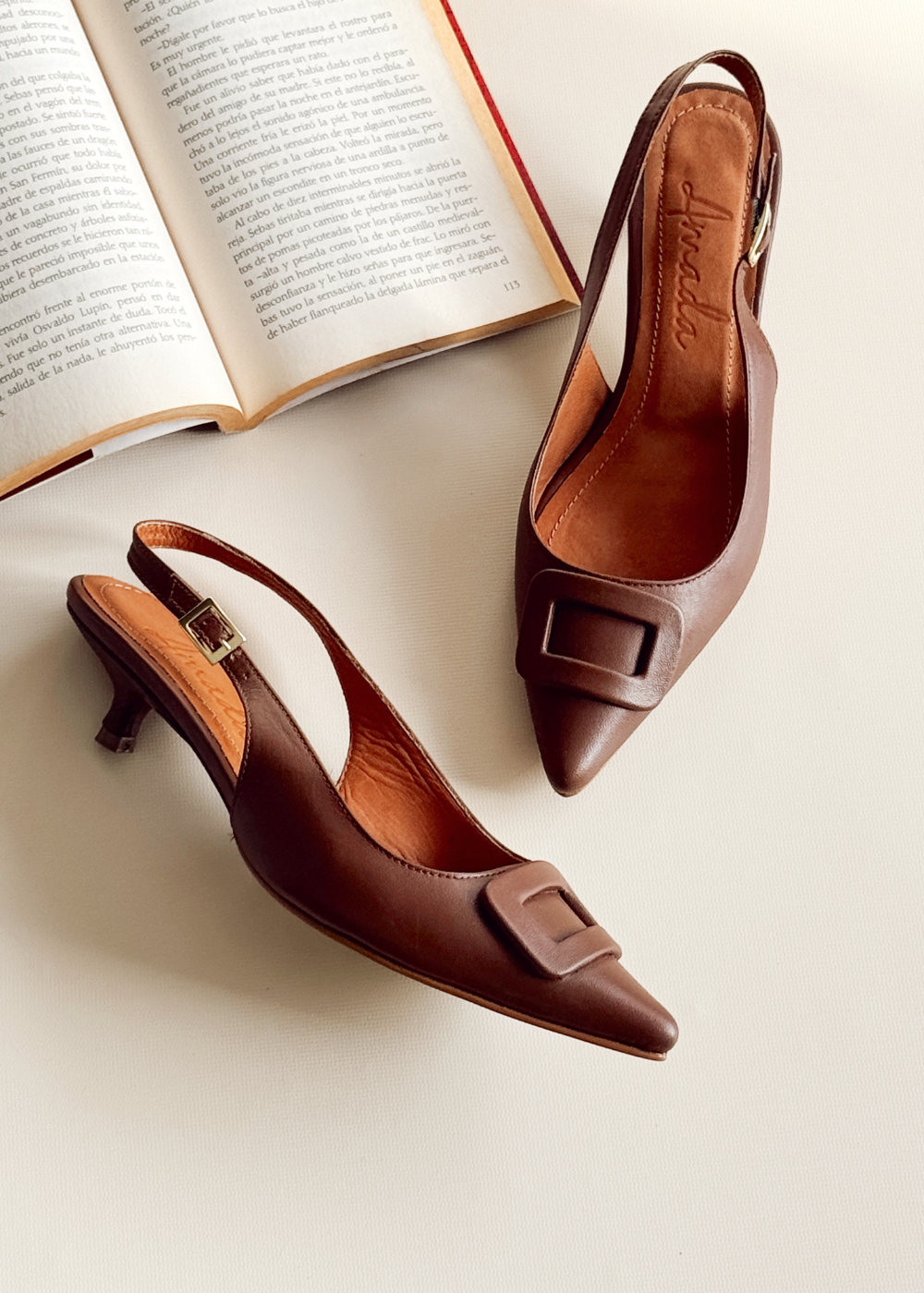 Fabricados en cuero, con accesorio cuadrado sobre la Capellada forrado en el mismo cuero, tacón de 3 cm y medio, correa en el talón con hebilla para graduar.